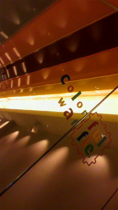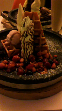 で、食したのー。えー、と、石焼きなんちゃらミックスベリーワッフル。暖かいワッフルと冷たいアイス、ベリーが美味でした。こん布ちゃんが頼んだメロンソーダがえらい事になってたけど。
